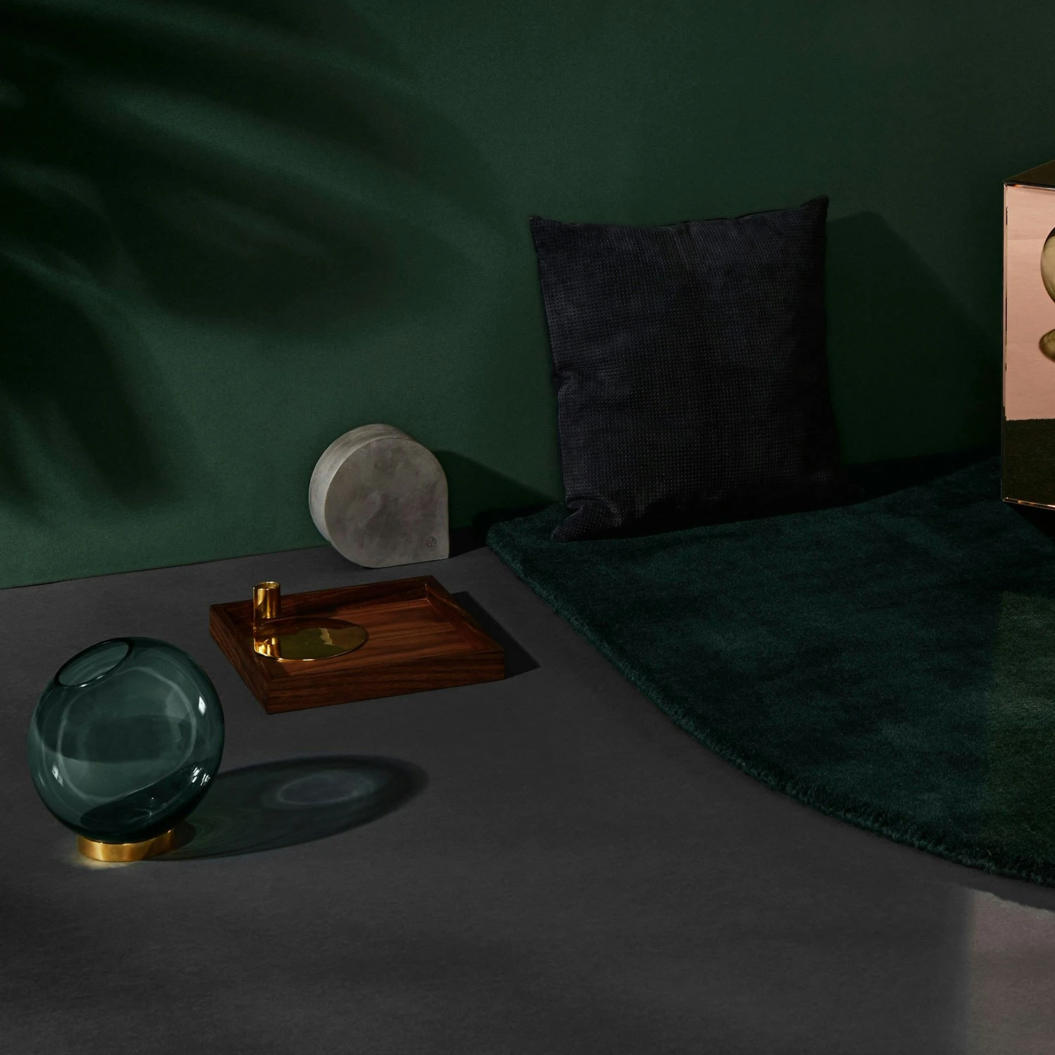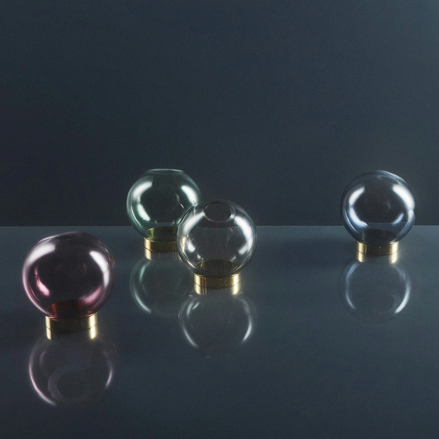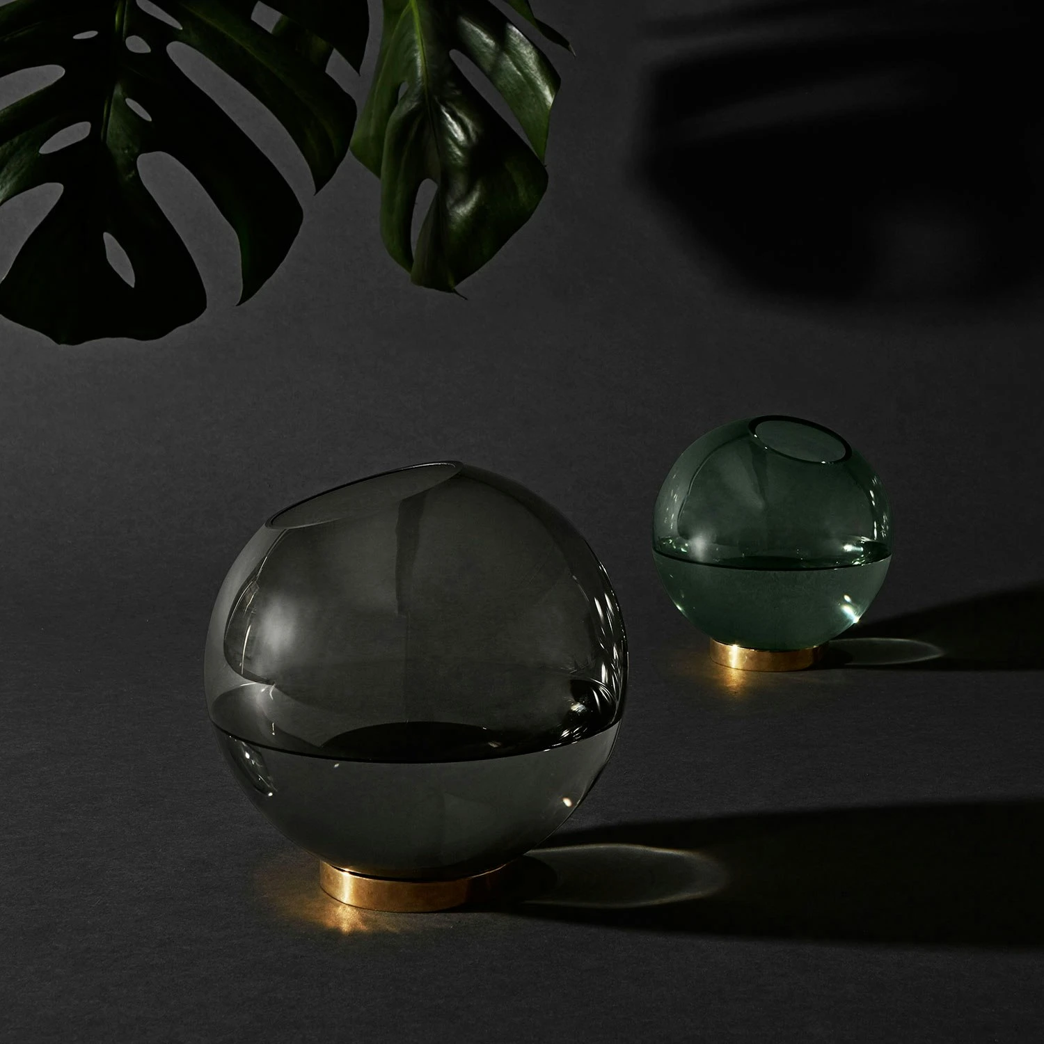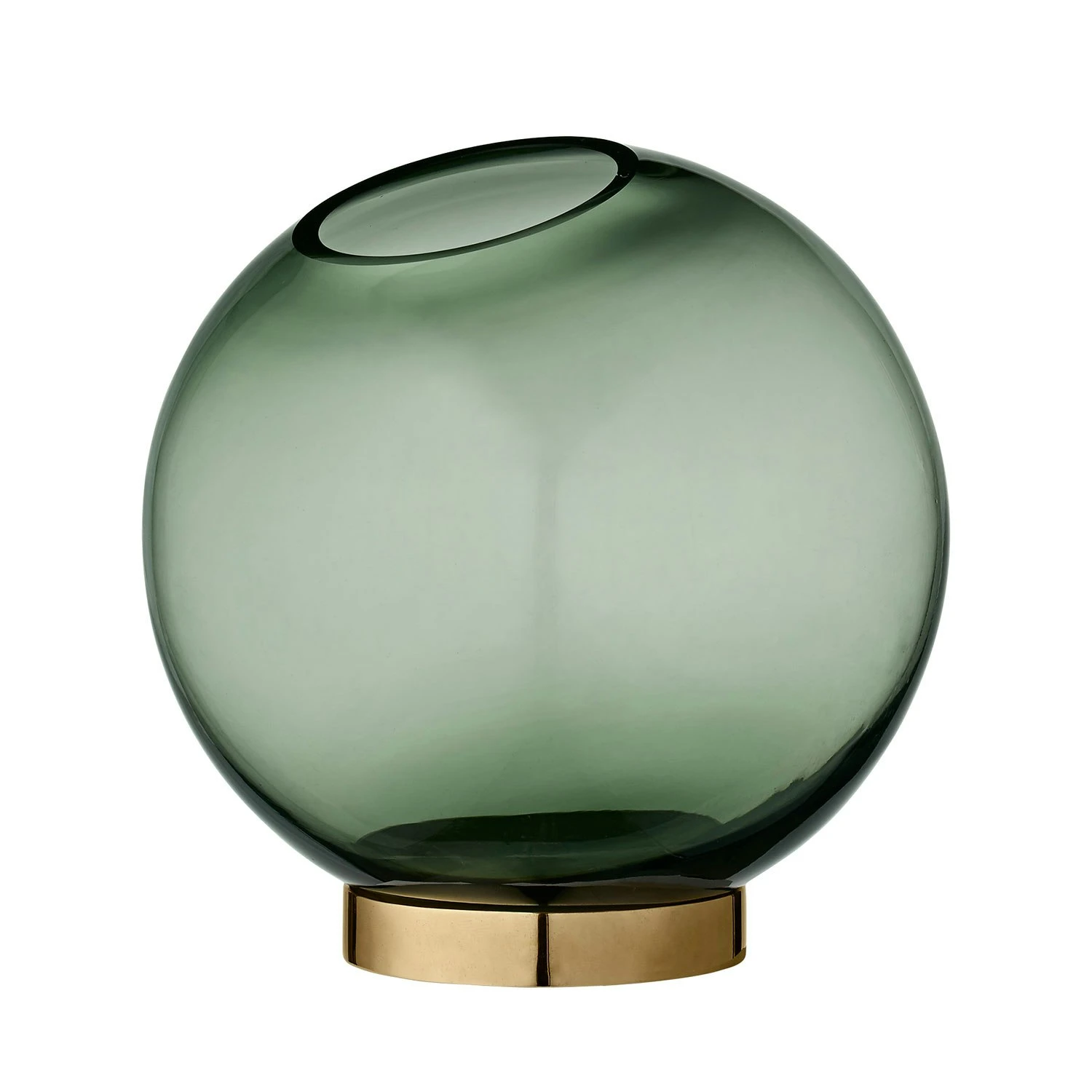 Globe is available in different colours and three sizes. This one has green toned glass which goes great together with the warm toned brass. The vases are ideal for flowers and plants, but they also fit for more creative solutions. The large and medium-sized Globes can be used for tealight candles, and the smallest is excellent for room scents, and is also perfect for single flowers.