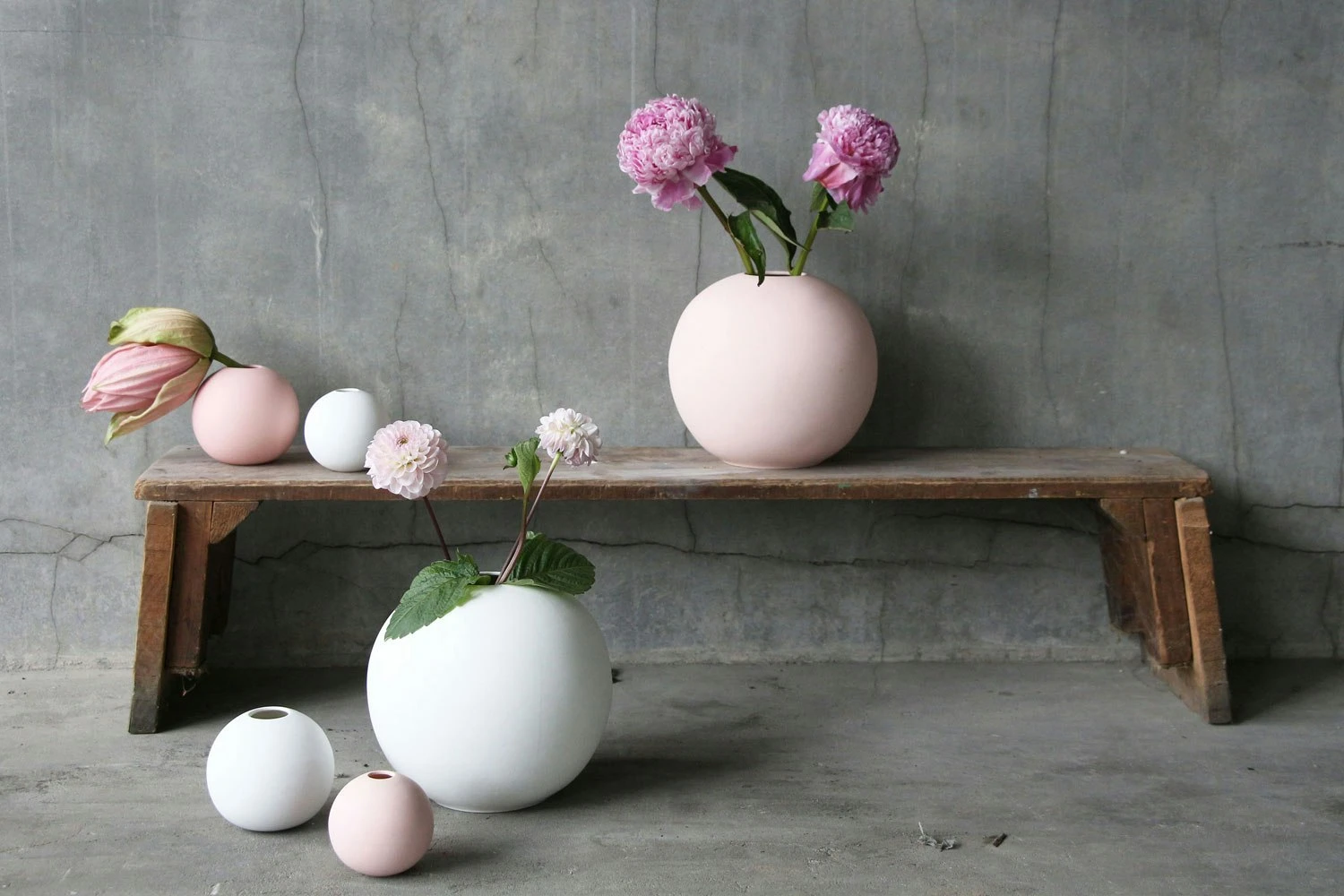 The vase by Cooee Design has an elegant design in ceramic with a round shape perfect for cut flowers and branches. Choose between different colours.