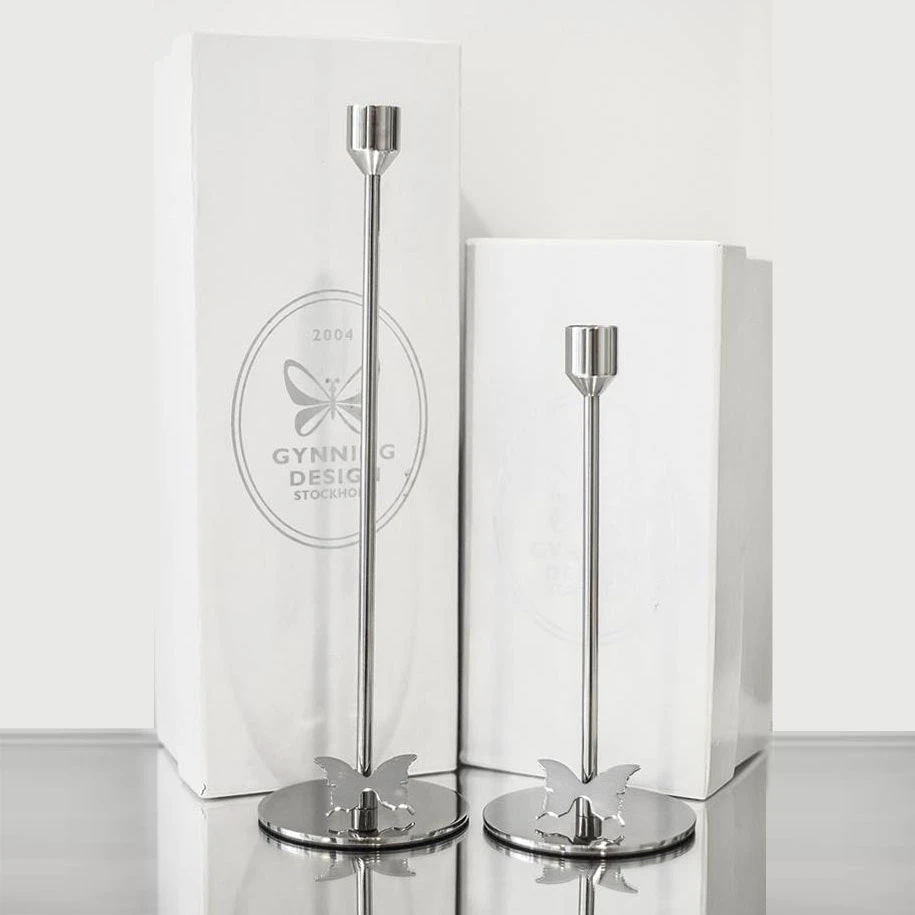 This candle holder has a stylish design with a butterfly that becomes a nice touch on the candlestick. Available in two different sizes.