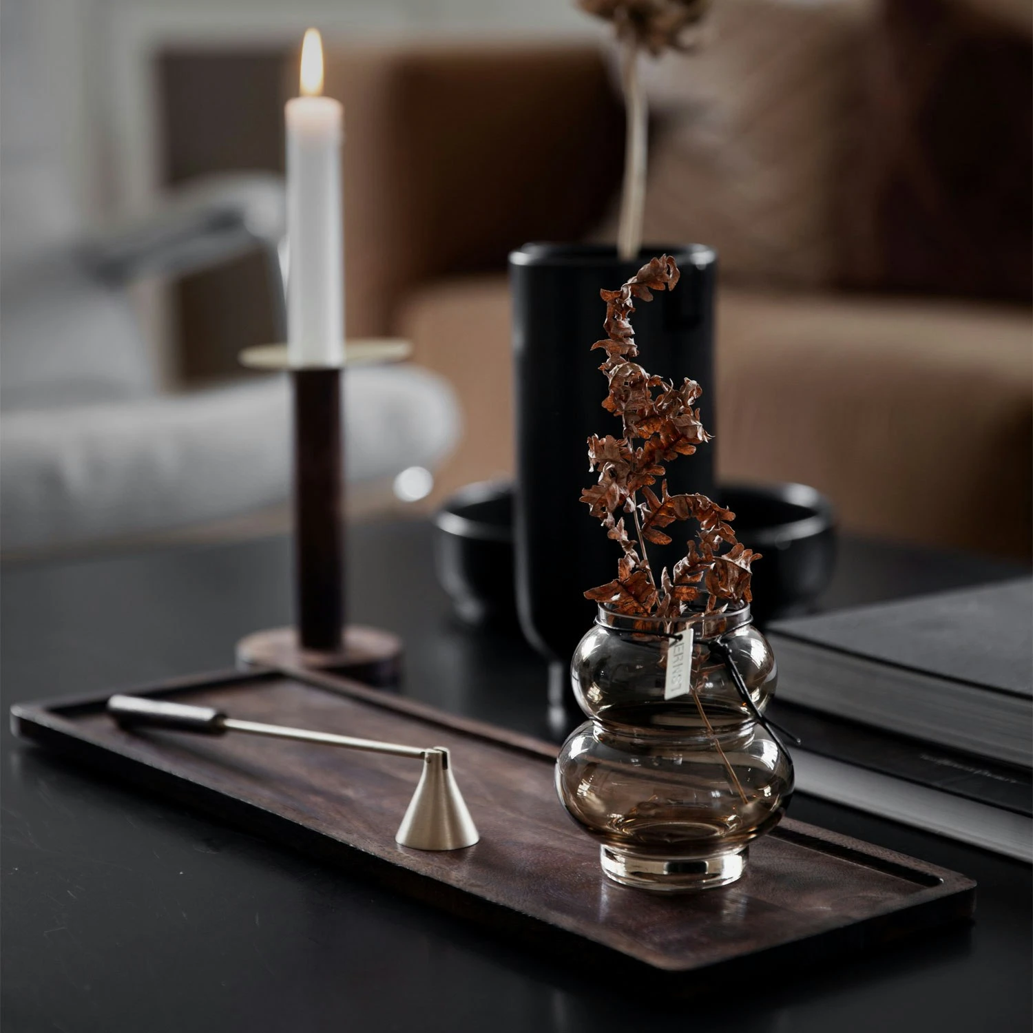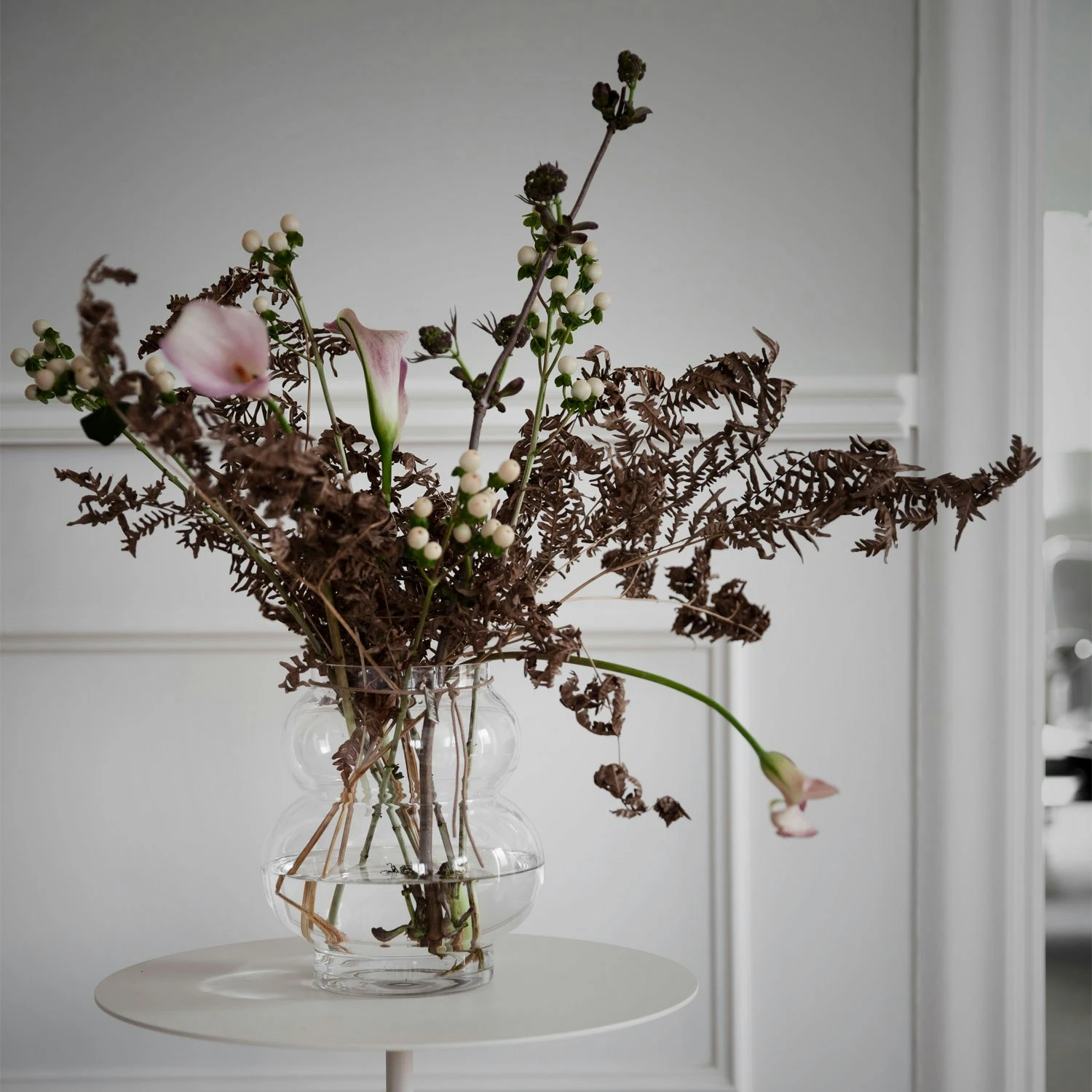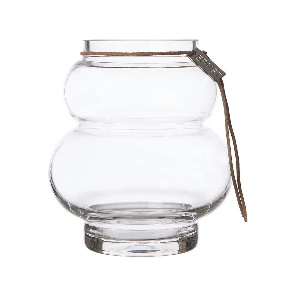The glass vase by Ernst Kirchsteiger has an elegant design in clear glass with soft curves perfect for cut flowers and branches. It has a decorative string in leather all-around with a plate in metal with discrete Ernst brand logo. Combine with other parts in the series and create your own personal look. Available in different sizes.