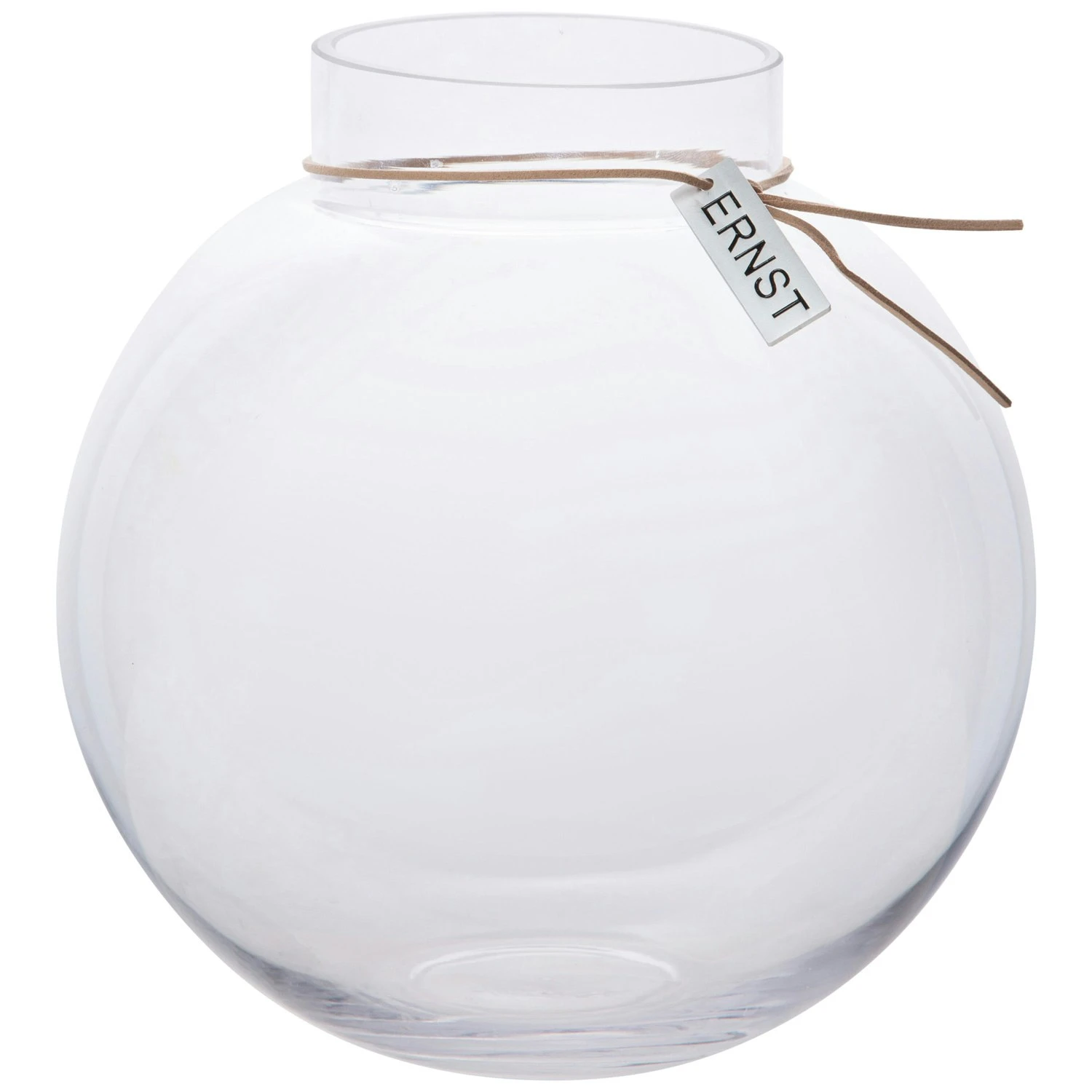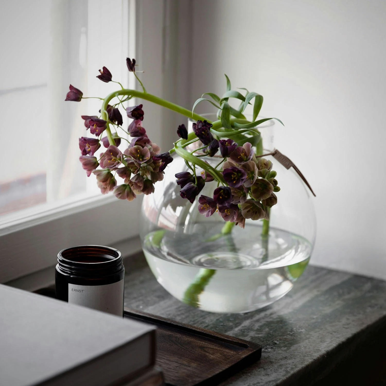 Ernst glass vase has a leather strap with an Ernst logo that gives a rustic feeling. The vase has a simple design and a Scandinavian expression that make the vase look good in every home.