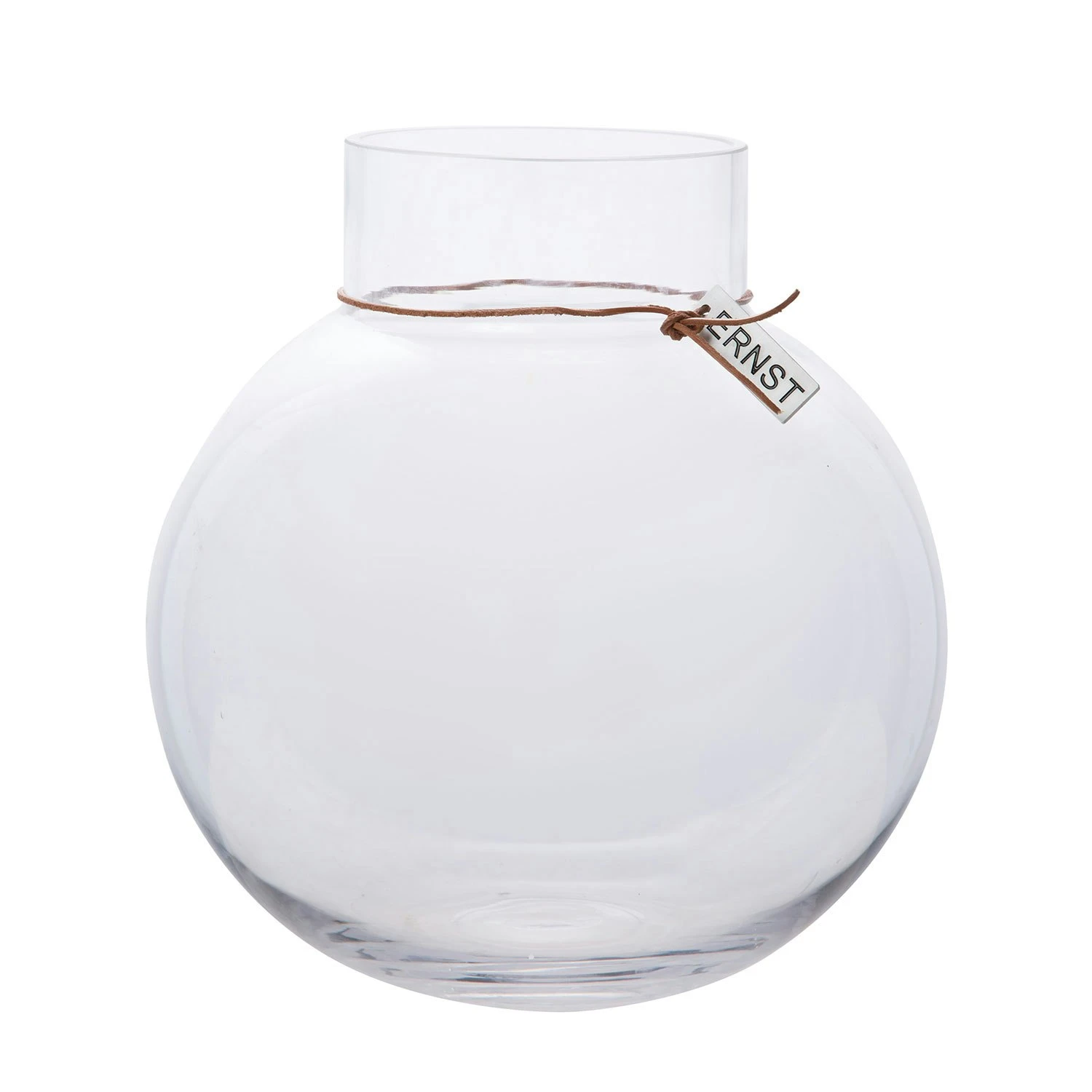 Ernst glass vase has a leather strap with an Ernst logo that gives a rustic feeling. The vase has a simple design and a Scandinavian expression that make the vase look good in every home.