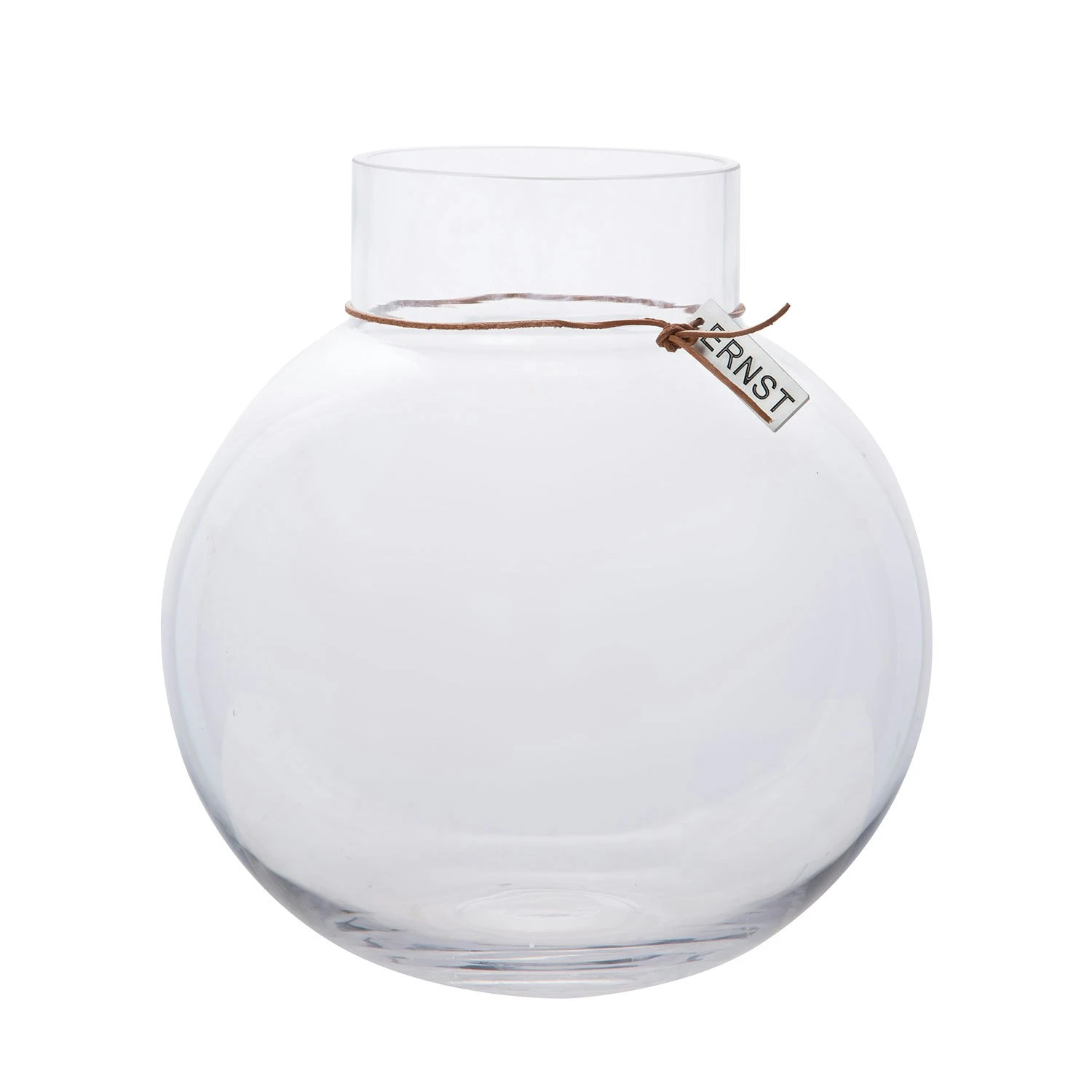 Ernst glass vase has a leather strap with an Ernst logo that gives a rustic feeling. The vase has a simple design and a Scandinavian expression that make the vase look good in every home.