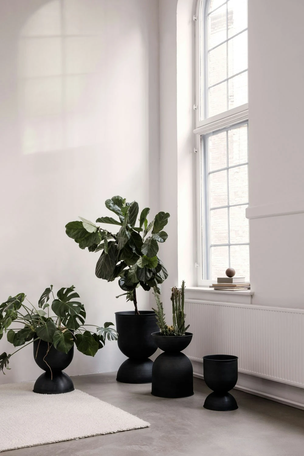 Hourglass is a pot from Ferm Living in metal with the shape of an hourglass. The pot can stand on both sides and has drainage holes in both directions, which means that excess water can drain away. Use for yourself or with one of the other pots in different sizes to achieve level differences.