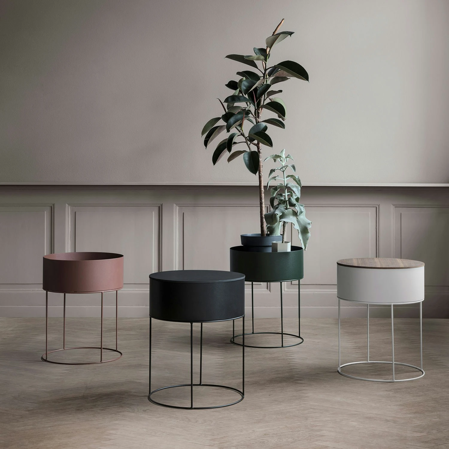 Plant Box Round has the same clean lines as the traditional Plant Box, but the round design offers a whole new range of styling options. Use it for plants or as a coffee table with practical storage. It is designed to fit the Wire Top Small that will turn the plant box into a chic coffee table.