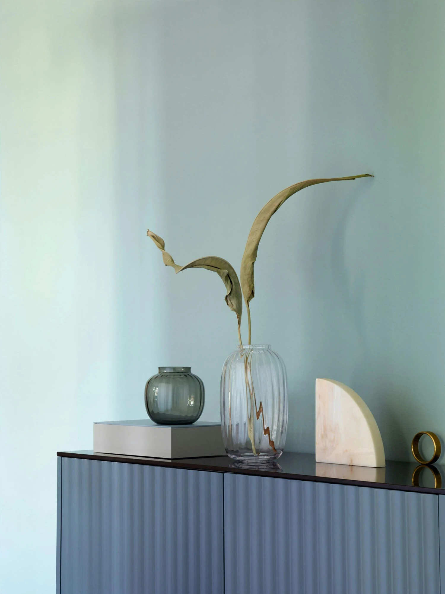 The beautiful vase Primula from Holmegaard is designed by Jacob E. Bang. It is made of mouth-blown glass and has an optical pattern that creates a vibrant feel. The clear glass gives the contents of the vase justice, whether you choose a big flower bouquet or a pair of single twigs.