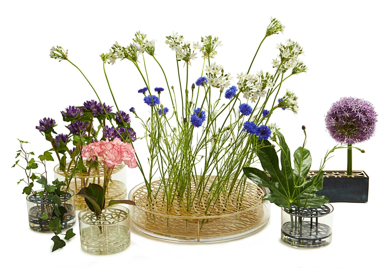Äng, which means meadow in Swedish, from Swedish Klong quickly became a modern classic. The beautiful vases give the opportunity to arrange flowers in a new way thanks to the simple but smart design that allows spectacular flower arrangements. Even the simplest bouquets look elegant in an Äng vase. According to Eva Schildt, who designed Äng, each flower needs two support points to stand and she had that in mind when she designed the vase with the double brass mesh.