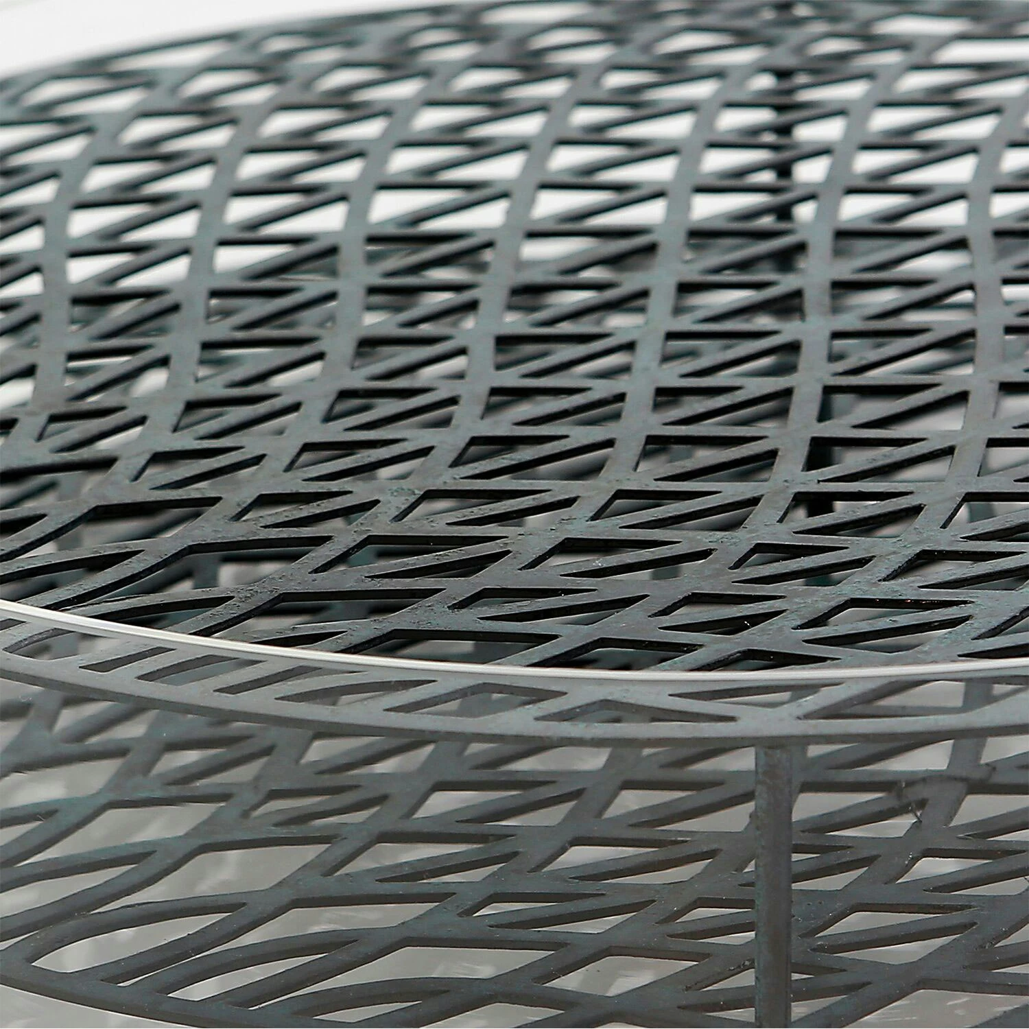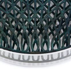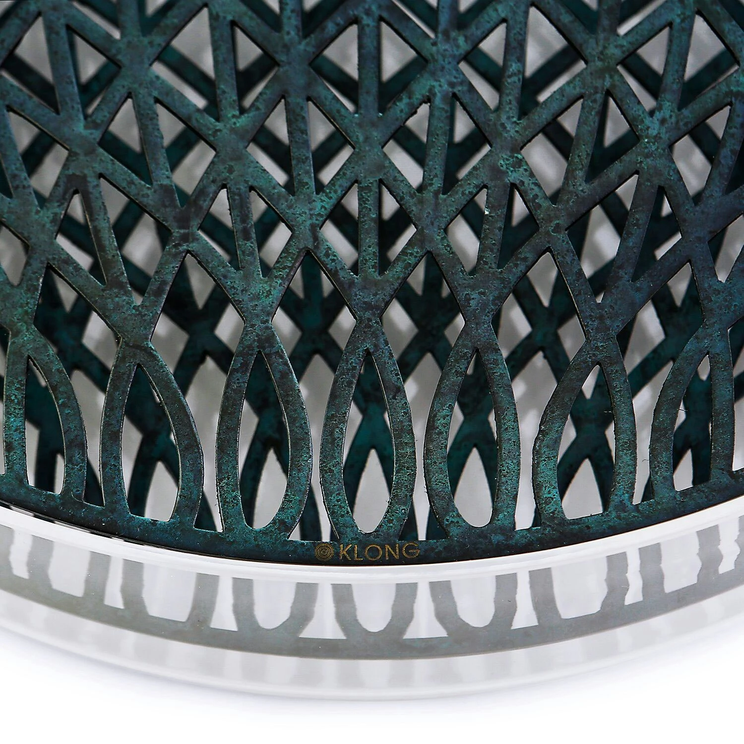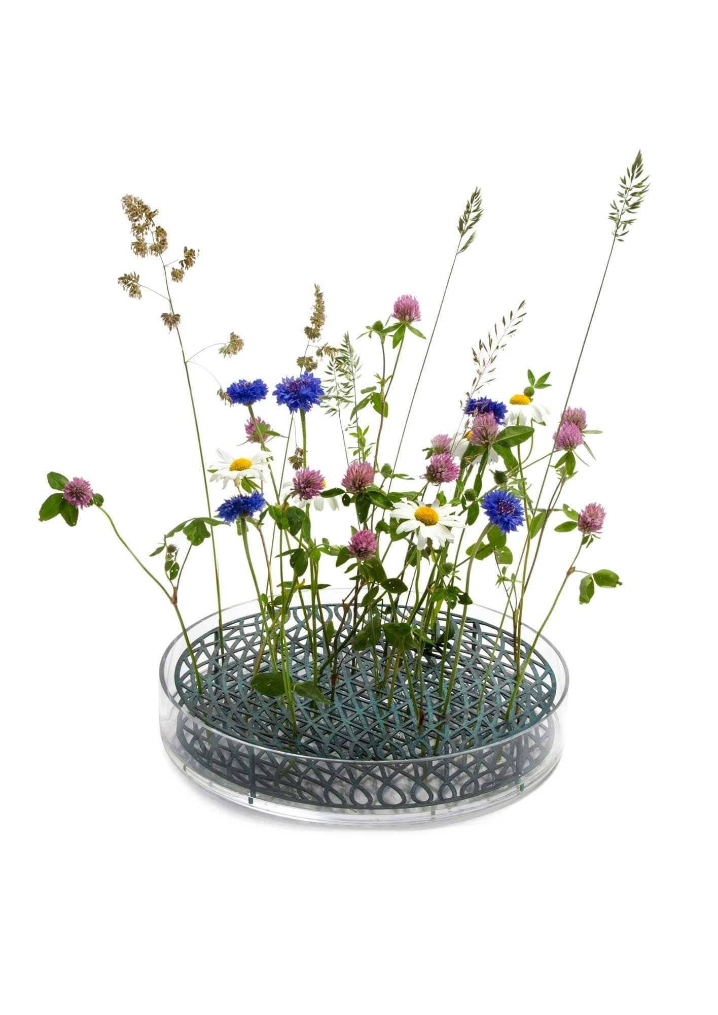 The vase is made of mouth-blown glass with handmade brass inserts – oxidized blue, silvered and pure brass. Äng is available in four different sizes, three of which are round and the fourth rectangular. The holes of the insert vary in shape and size and, like on a meadow, the cut flowers fall naturally in place. The vase becomes as beautiful embellishment either filled with colourful flowers or single twigs.