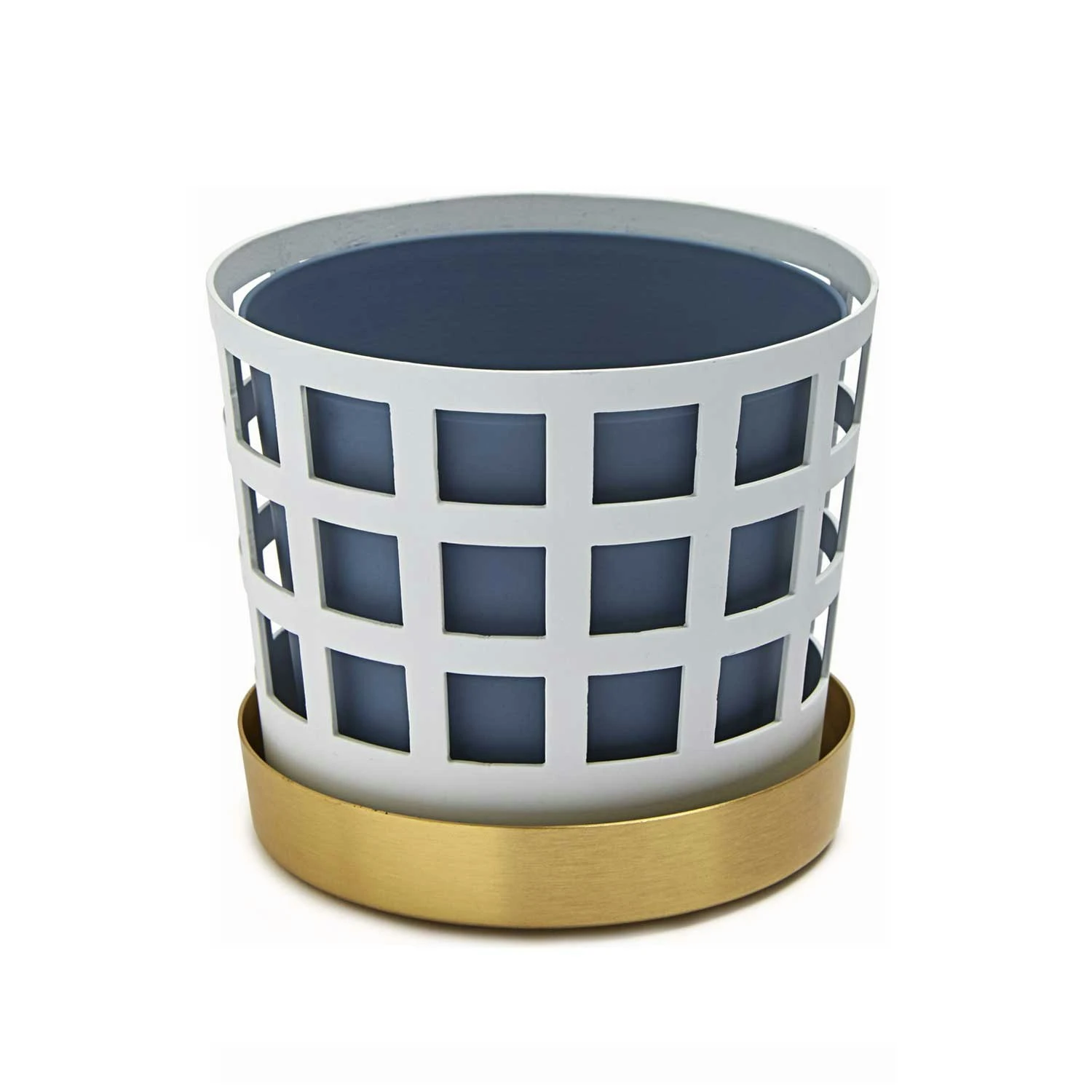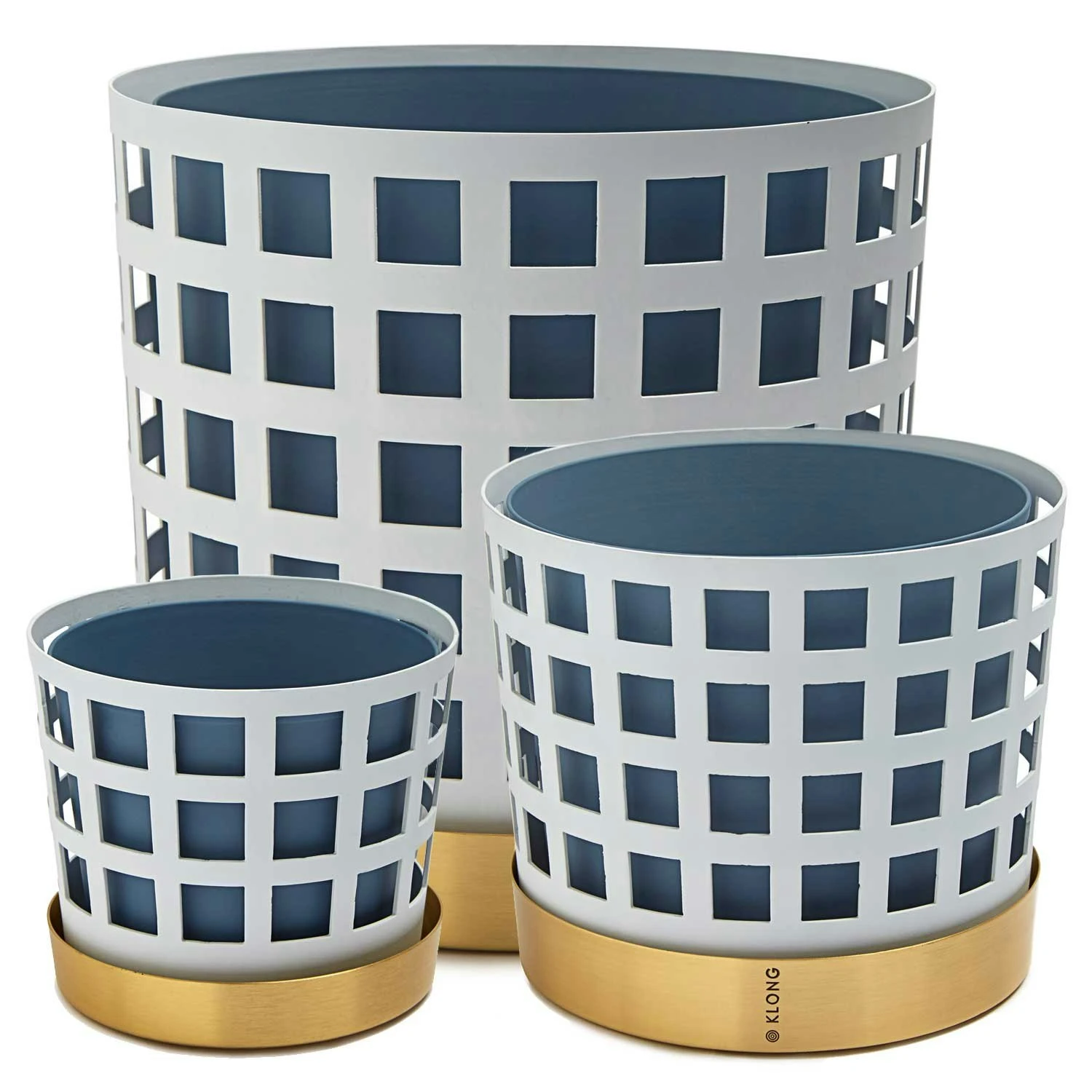 Trio Flower Pot from Klong, designed by Ania Pauser. The pot consists of three parts, a blue inside pot, an outer pot in white and a plate. The pots are made of thin lacquered steel and the plate is in brass with Klong’s logo engraved. The pattern of the outer pot is handmade and gives the pots an exciting depth and character without drawing the attention from the flowers in it.