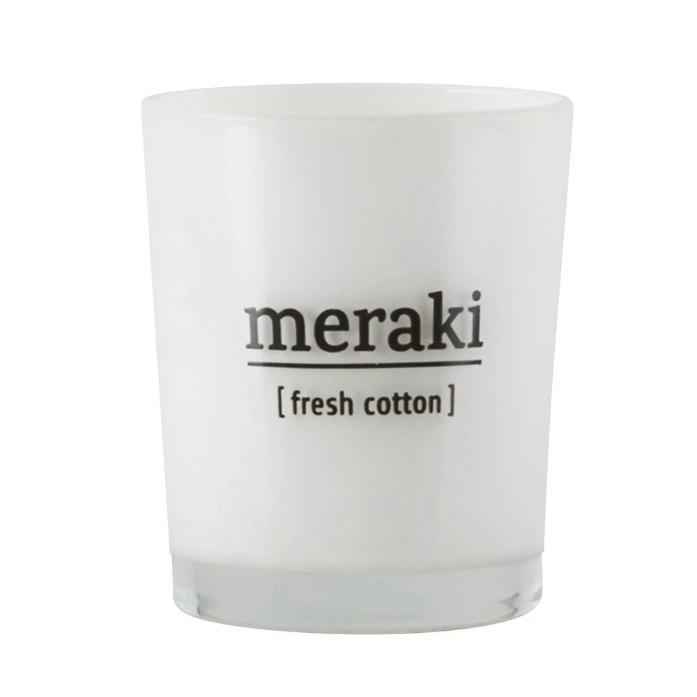 Meraki scented candle with the scent Fresh Cotton. The light is made of soybean oil and gives you a clean light that soothes much less than a normal light. The scented light comes in a stylish semi-transparent white glass with the text “meraki” and “fresh cotton” stylized printed in black on the outside. Available in two different sizes.