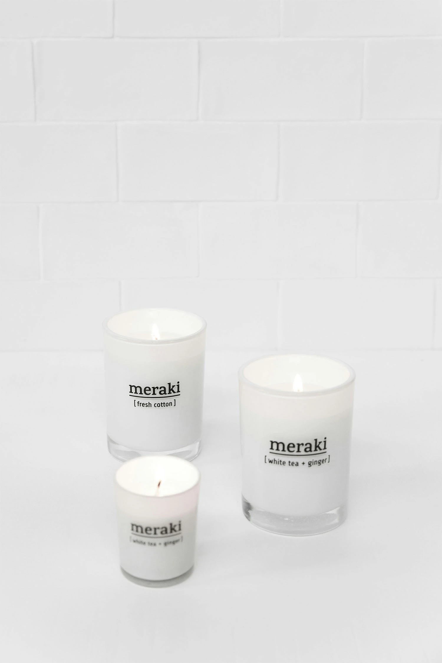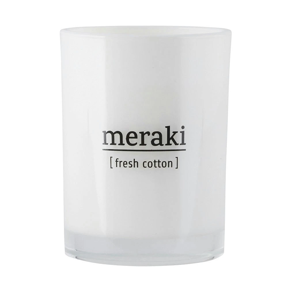 Meraki scented candle with the scent Fresh Cotton. The light is made of soybean oil and gives you a clean light that soothes much less than a normal light. The scented light comes in a stylish semi-transparent white glass with the text “meraki” and “fresh cotton” stylized printed in black on the outside. Available in two different sizes.