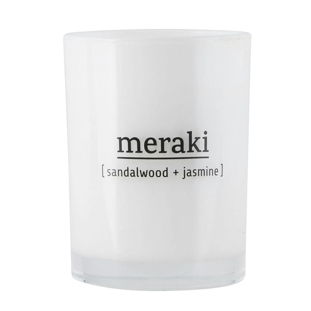 Meraki scented candle with the scent Sandalwood & Jasmine. The light is made of soybean oil and gives you a clean light that soothes much less than a normal light. The scented light comes in a stylish semi-transparent white glass with the text “meraki” and “sandalwood + jasmine” stylized printed in black on the outside. Available in two different sizes.